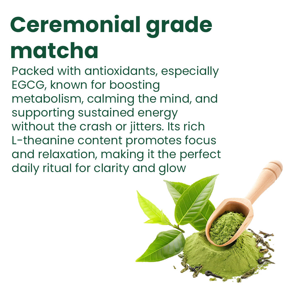 Water, Chicory Root Fibre, Agave Nectar, Lemon Juice, Ceremonial Grade Matcha from Japan, Natural Flavourings, Lion’s Mane Extract, Reishi Mushroom, Ginkgo Biloba, Copper Chlorophyllin, Flaxseed Fibre, Natural Green Coffee Extract, Vitamin B2 (Riboflavin).