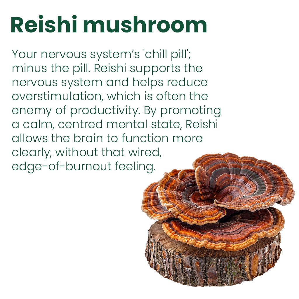 A purposeful blend of lion’s mane, reishi, and ginkgo biloba (long used for clarity and balance) teams up with vitamin B2, which contributes to normal energy-yielding metabolism and helps reduce tiredness and fatigue. It’s your go-to when you want to feel switched on, without feeling overstimulated.