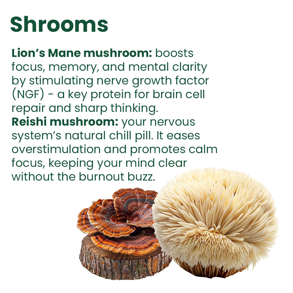 Juicy, vibrant, and designed for clear thinking. Berry Smart pairs ceremonial matcha with lion’s mane, reishi, and ginkgo biloba to support cognitive performance, balance, and mental clarity, alongside vitamin B2 which contributes to normal energy-yielding metabolism and helps reduce tiredness and fatigue. The flavour is juicy raspberry for a refreshing twist on functional matcha.